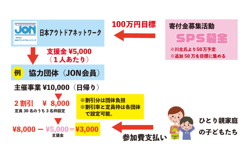 連携団体【しんぐる・まざーふぉーらむ】を通じての申込者や、各団体で確認できる「ひとり親家庭の子どもたち」がその枠で参加された場合、JONから支援金を、終了後送金させていただきます。